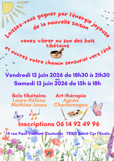 Laissez vous gagner par l’énergie joyeuse de la nouvelle saison ! Venez vibrer aux sons des bols tibétains de Laure-Hélène et ouvrez votre chemin sensoriel vers l’été ! L’atelier d’art-thérapie aura lieu le vendredi 12 juin de 18h 30 à 21h30 (aménagement possible d’horaire) ou le samedi 13 juin 2026 de 15h à 18h, 14 rue Paul Vaillant Couturier 78210 Saint Cyr l’Ecole. Lire la suite…